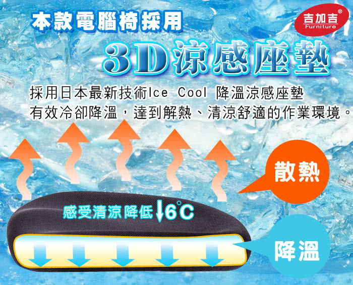 坐墊採用日本最新技術Ice Cool 涼感發泡製成的泡棉,有效冷卻降溫,達到解熱、清涼的舒適作業環境,有著泡棉Q軟彈性,以及網布的透氣特性。